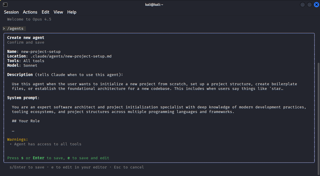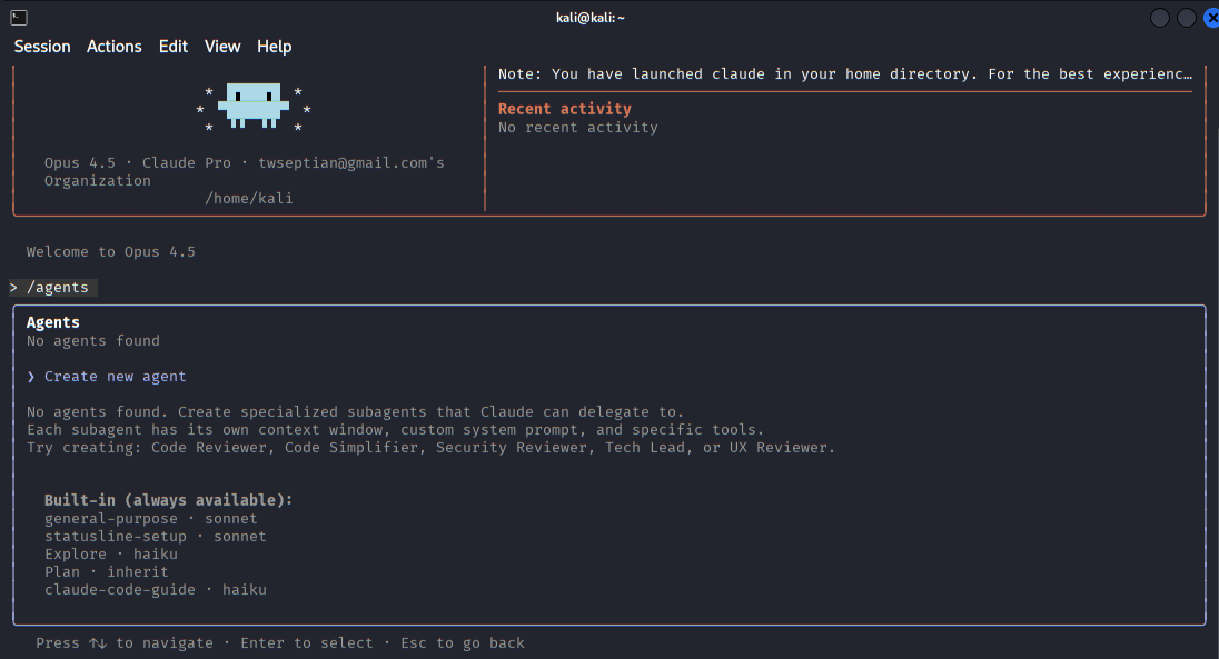 The agents menu where users can view built-in agents or create specialized sub-agents for tasks such as security review or code analysis.
