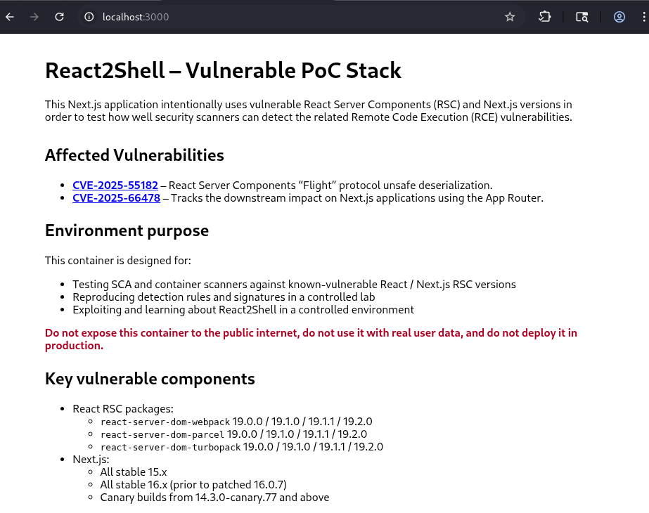 Docker poc lab for CVE-2025-55182 / CVE-2025-66478 (React2Shell) detection and exploitation – https://github.com/l4rm4nd/CVE-2025-55182 ↩︎ ↩︎2 ↩︎3 ↩︎4